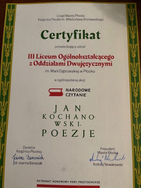6 września już po raz 14. w Mediatece Książnicy Płockiej odbyła się wspólna akcja czytania. Lekturą tegorocznej edycji Narodowego Czytania były poezje Jana Kochanowskiego. W tak ważnym wydarzeniu nie mogło zabraknąć uczniów naszej szkoły. Uczennice oddziału 4C: Paulina Budnicka i Pola Kralska (pod opieką p. Anny Lewandowskiej) czytały fragmenty Pieśni Mistrza z Czarnolasu. Odpowiednia sceneria i stroje z epoki sprawiły, że było to prawdziwe święto literatury i wspólnego przeżywania słowa.