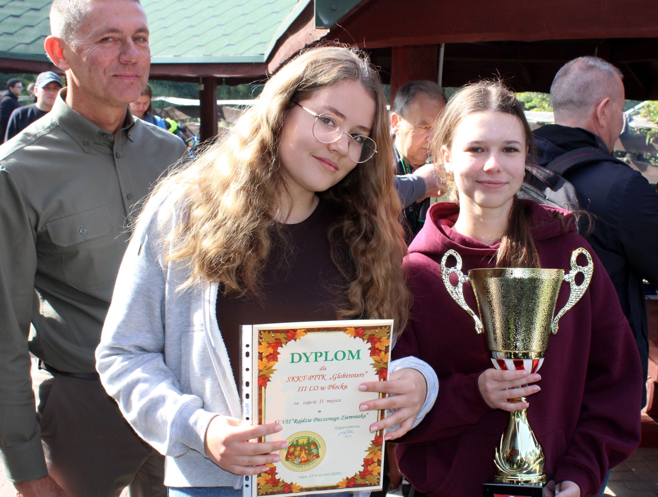 27 września 2024 r. odbył się XLVII Rajd Pieczony ziemniak, w którym uczestniczyło 30 uczniów z III LO (1b, 1c, 1d, 1e, 2b, 3d, 3e, 3f, 3g). Opiekę nad drużyną SKKT-PTTK Globtroters sprawowali: p. Bogdan Majewski i p. Agnieszka Śladowska-Siwek. Zbiórka naszej grupy odbyła się przy Odwachu (siedziba OM PTTK). Po sprawdzeniu listy obecności i rozdaniu znaczków rajdowych ruszyliśmy z innymi grupami na szlak turystyczny pod kierunkiem przodowników turystyki. Najpierw maszerowaliśmy Mostówką, a potem szliśmy mostem, gdzie mogliśmy podziwiać Wisłę i skarpę wiślaną Płocka. Po zejściu z mostu przeszliśmy przez Radziwie, aby wejść w obszary leśne. Dalsza trasa wędrówki wiodła po obszarze Gostynińsko–Włocławskiego Parku Krajobrazowego, w dużej mierze przez Rezerwat Przyrody Jarząbek. Szlak czerwony prowadził nas głównie malowniczymi duktami leśnymi, mieliśmy więc okazję obejrzeć rzeźbę młodoglacjalną z borami mieszanymi. W trakcie naszej szesnastokilometrowej wędrówki odpoczywaliśmy na polanach leśnych i przy wiadukcie kolejowym, gdzie mogliśmy uzupełnić stracone kalorie. Zakończenie rajdu odbyło się na terenie Nadleśnictwa Łąck, gdzie otrzymaliśmy smaczne pieczone ziemniaki i mogliśmy upiec kiełbaski przy wspólnym ognisku. Ostatnim miłym akcentem było rozdanie dyplomów i pucharów dla najlepszych drużyn. Wśród szkół ponadgimnazjalnych nasza drużyna zajęła II miejsce. Po zakończeniu rajdu zostaliśmy odwiezieni do Płocka specjalnie dla nas podstawionymi autobusami KM. Spędziliśmy czas miło i przyjemnie, mimo że rajd odbywał się w sobotę. Pozdrawiamy wszystkich i zachęcamy do wędrówek po Ziemi Mazowieckiej!!!