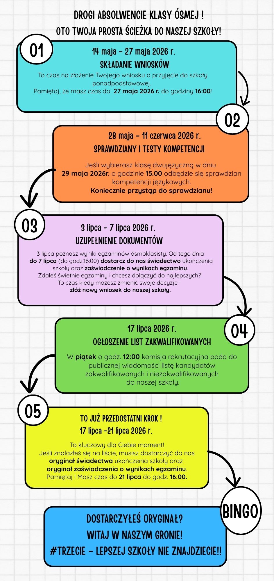 Dyrektor III Liceum Ogólnokształcącego z Oddziałami Dwujęzycznymi informuje, że w postępowaniu rekrutacyjnym na rok szkolny 2026/2027 będą brane pod uwagę oceny wymienione na świadectwie ukończenia szkoły z następujących przedmiotów: